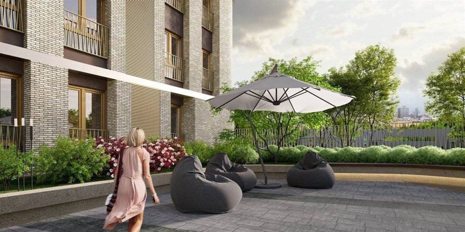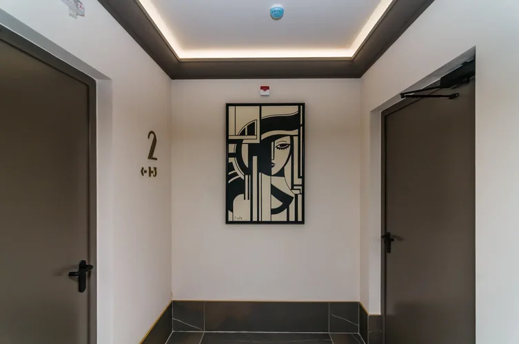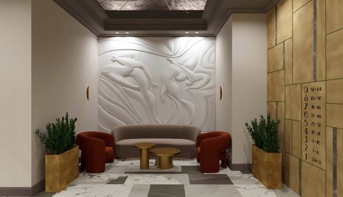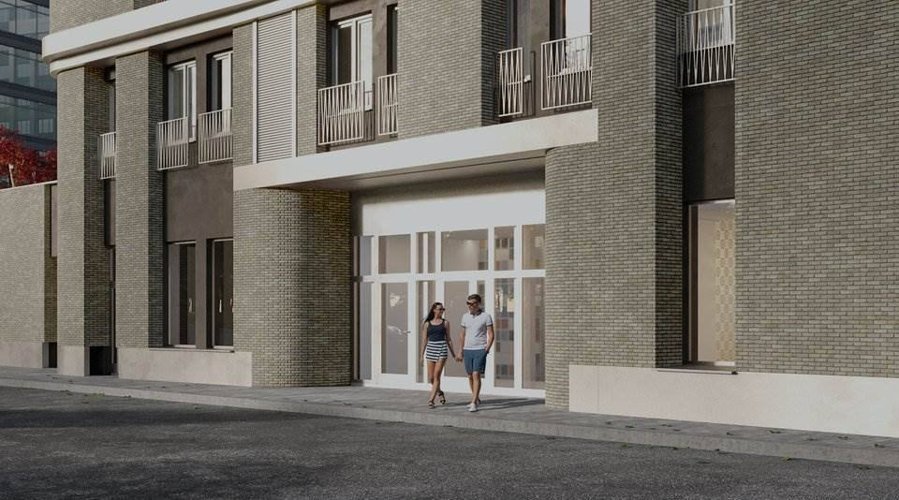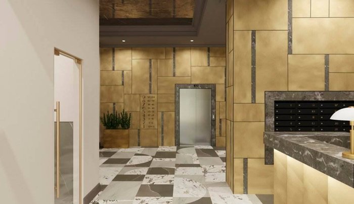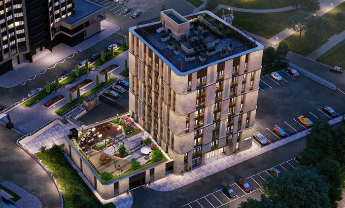 Роскошная отделка фактурным кирпичом и нержавеющей сталью, изысканная подсветка фасада, элегантные и комфортные места общего пользования.
