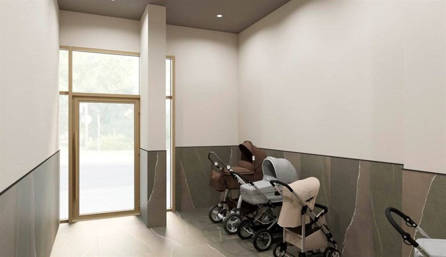 Здесь расположен ресепшн - зона консьержа, колясочная комната и детский уголок.